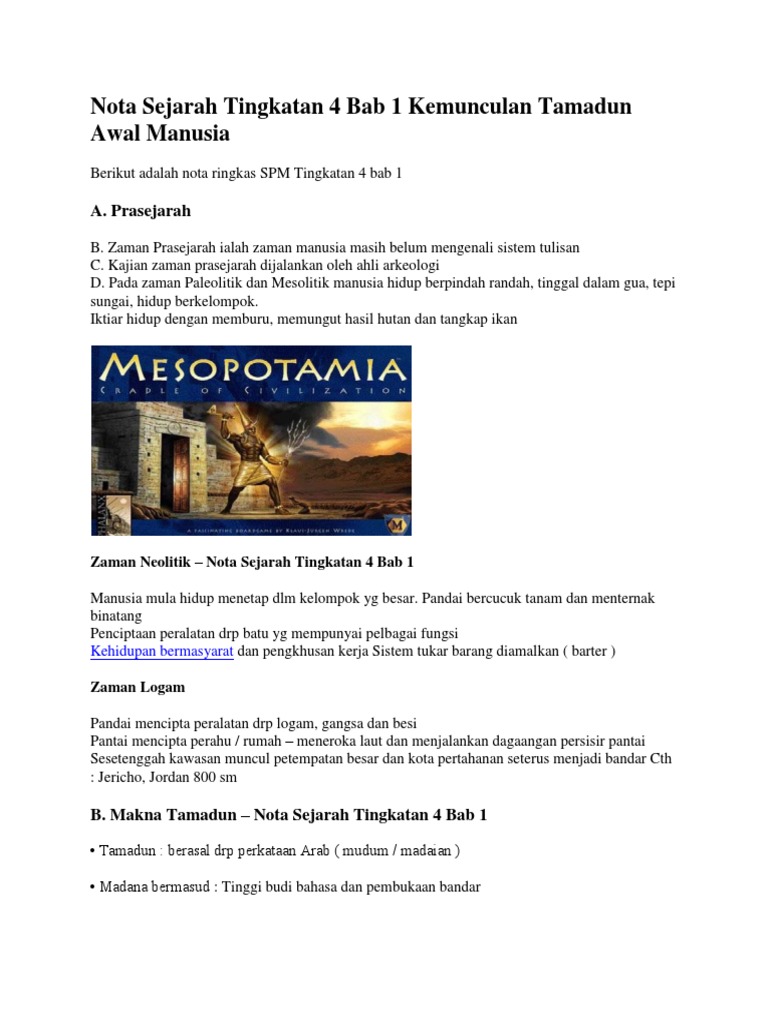 Kesimpulannya, terdapatnya kesamaan dalam proses pembentukan tamadun. I'm here to help you guys. Parameswarakedatangan membunuh parameswar temagi a ke melaka1. Tamadun awal dunia secara umum terletak di sungai tigris, euphrates, nil, hwang ho, dan. Sejarah tingkatan 1 pdfall software. Boleh dijadikan induksi atau input kepada pelajar sebelum. Terdapat 10 bab utama yang murid perlu kuasi. Bab 2 kebangkitan nasionalisme (bahagian 1). Bab 1 kemunculan tamadun awal manusia. Pokok dikaitkan tempat kediaman tuhan agama. Zaman pra sejarah 4 tahap zaman paleolitik zaman mesolitik zaman neolitik zaman logam 1.zaman gangsa 2. Sejarah tingkatan 4 kssm : Sejarah tingkatan 1 bab 1 :