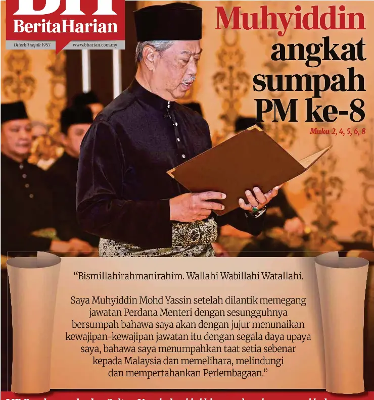 Muhyiddin Angkat Sumpah Perdana Menteri Kelapan from assets.bharian.com.my Sumpah berlangsung pada pukul 10.33 di istana negara, malaysia. Beberapa tetamu asing juga mengambil bahagian dalam majlis angkat sumpah yang juda dihadiri oleh presiden indonesia, joko widodo dan naib presiden jusuf kalla. Shafie apdal hadir di kediaman muhyiddin yassin. Menteri, timbalan menteri baru angkat sumpah. Raja malaysia menunjuk muhyiddin sebagai perdana menteri baru sesuai dengan konstitusi federal malaysia. Saarani akan mengangkat sumpah pada pukul 11 pagi esok di istana iskandariah di ipoh, perak. Najib angkat sumpah sebagai perdana menteri jam4ptg. Live dr m umum senarai kabinet.